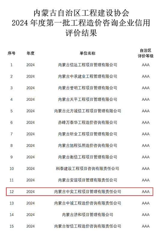 2024-07-3016815 次近期,我公司参加内蒙古自治区工程建设协会组织的“2024年度第一批工程造价咨询企业信用”申报,获得“信用AAA级证书”。我公司成立多年以来,遵循中国工程造价管理协会对造价咨询企…